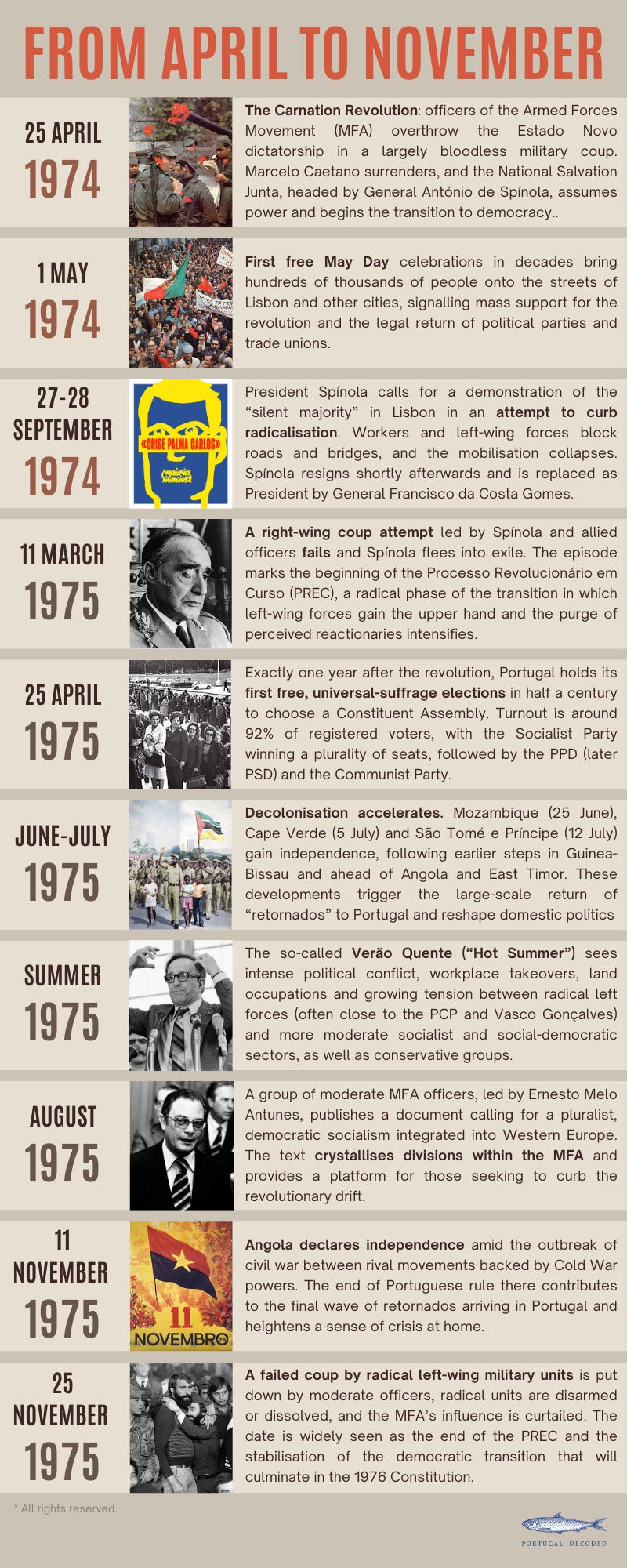 August, 1975. A more moderate faction in the Armed Forces movement lays down a framework for pluralist, democratic socialist governance as a counterpoint to more radical left-leaning groups.